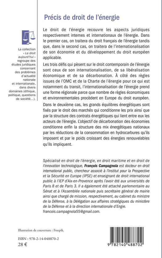 Le droit de l'énergie recouvre les aspects juridiques respectivement internes et internationaux de l'énergie. Dans le premier cas, on traitera du droit français de l'énergie tandis que, dans le second cas, on traitera de l'internationalisation de son économie et du développement du droit européen applicable. Les trois défis qui pèsent sur le droit contemporain de l'énergie sont ceux de son internationalisation, de sa libéralisation économique et de sa décarbonation. À côté des règles issues de l'OMC et de la Charte de l'énergie pour ce qui est notamment du transit, l'internationalisation de l'énergie prend une forme régionale parce que nombre de règles économiques et environnementales procèdent en Europe du droit européen. Dans le deuxième cas, les grands équilibres énergétiques sont fixés par le droit des marchés qui conditionne les prix ainsi que par la structure des contrats énergétiques qui lient entre eux les acteurs de l'énergie. L'objectif de décarbonation des économies conditionne enfin la structure des mix énergétiques nationaux par les réductions de la consommation en hydrocarbures qu'ils imposent et par le poids croissant des énergies renouvelables qu'ils impliquent.