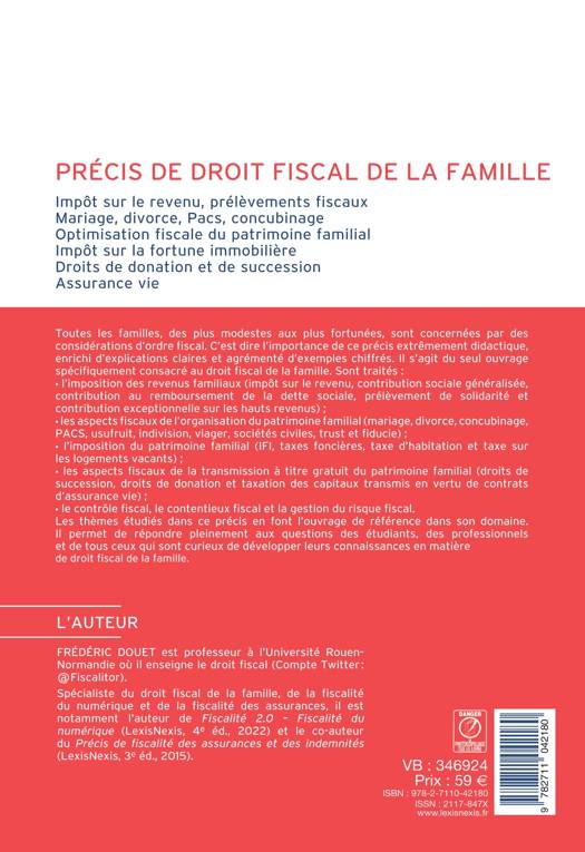 1/ Un ouvrage extrêmement complet. 2/ Plus de 60 tableaux et de nombreux exemples chiffrés. Partie 1. - L'imposition des revenus familiaux Titre 1. - L'impôt sur le revenu (IR) Titre 2. - Les prélèvements sociaux Titre 3. - La contribution exceptionnelle sur les hauts revenus Partie 2. - Les aspects fiscaux de l'organisation du patrimoine familial Titre 1. - Aspects fiscaux de l'organisation du patrimoine des couples Titre 2. - Aspects fiscaux des modalités d'organisation de la propriété Partie 3. - L'imposition du patrimoine familial Titre 1. - L'impôt de solidarité sur la fortune Titre 2. - Les impôts assis sur le patrimoine familial immobilier Partie 4. - Les aspects fiscaux de la transmission à titre gratuit du patrimoine familial Titre 1. - Les droits de succession Titre 2. - L'imposition des libéralités Titre 3. - Régime fiscal des contrats d'assurance vie au regard des droits de mutation à titre gratuit Partie 5. - Contrôle fiscal, contentieux fiscal, solidarité et gestion du risque fiscal Titre 1. - Contrôle fiscal, contentieux fiscal et solidarité Titre 2. - La gestion du risque fiscal Partie 6. - Études thématiques