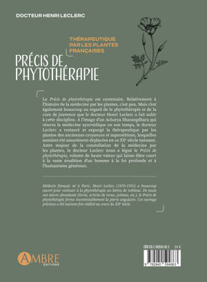 Le Précis de phytothérapie est centenaire. Relativement à l'histoire de la médecine par les plantes, c'est peu. Mais c'est également beaucoup au regard de la phytothérapie et de la cure de jouvence que le docteur Henri Leclerc a fait subir à cette discipline. A l'image d'un Acharya Sharangdhara qui rénova la médecine ayurvédique en son temps, le docteur Leclerc a restauré et expurgé la thérapeutique par les plantes des anciennes croyances et superstitions, lesquelles auraient été assurément déplacées en ce XXe siècle naissant. Astre majeur de la constellation de la médecine par les plantes, le docteur Leclerc nous a légué le Précis de phytothérapie, volume de haute valeur qui laisse libre court à la vaste érudition d'un homme à la foi profonde et à l'humanisme généreux.