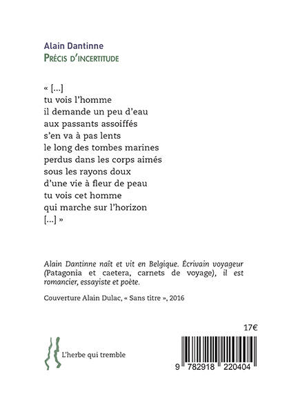 « Précis d’incertitude » est écrit sous le signe du voyage. « Au cœur de l’écriture l’ombre de la main » : La main, instrument du poète, qui retrace dans ce recueil une sorte de résumé de sa vie : d’abord l’adolescence et ses marges incertaines ; puis les voyages, « errances » qui élargissent l’homme où il tente de « retrouver les sentiers/ instables de la beauté » ; puis la contemplation de la beauté à travers la peinture, ici celle d’Edvard Munch ; enfin, des poèmes dédiés à ceux qui comme lui sont restés en marge, à rechercher « cette paroisse/ de l’enfance éblouie ».