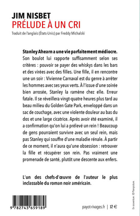Stanley Ahearn a un boulot peinard qui lui rapporte de quoi se payer son whisky et ses virées. Un soir, il rencontre Vivienne Carnaval dans un bar. Elle a des yeux verts et n'a pas l'air farouche. À l'issue d'une soirée bien arrosée, Stanley la ramène chez elle... Il se réveille vingt-quatre heures plus tard avec une cicatrice au bas du dos. Après examen, il se confirme qu'on lui a volé un rein ! La plupart des gens vivent sans problème avec un seul rein, mais pas Stanley, qui souffre d'une maladie rénale chronique. Désormais, son unique obsession sera de retrouver la fille aux yeux verts. Prélude à un cri pousse au paroxysme les qualités de Nisbet : une écriture brillante au service d'une imagination terrifiante et d'un macabre sens de l'humour.