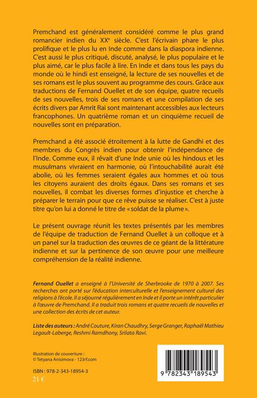 Premchand est généralement considéré comme le plus grand romancier indien du XXe siècle. C'est l'écrivain phare le plus prolifique et le plus lu en Inde comme dans la diaspora indienne. C'est aussi le plus critiqué, discuté, analysé, le plus populaire et le plus aimé, car le plus facile à lire. Dans ses romans et ses nouvelles, il combat les diverses formes d'injustice et cherche à préparer le terrain pour que ce rêve puisse se réaliser. Le présent ouvrage réunit les textes présentés à un colloque au Centre d'Etudes du religieux contemporain sur la traduction des oeuvres de ce géant de la littérature indienne et sur la pertinence de son oeuvre pour une meilleure compréhension de la réalité indienne.