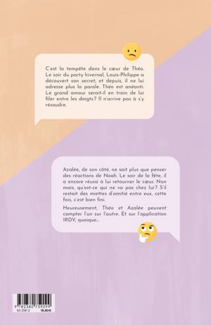C’est la tempête dans le cœur de Théo. Le soir du de la fête hivernale, Louis-Philippe a découvert son secret, et depuis, il ne lui adresse plus la parole. Théo est anéanti. Le grand amour serait-il en train de lui filer entre les doigts? Il n’arrive pas à s’y résoudre. Azalée, de son côté, ne sait plus que penser des réactions de Noah. Le soir de la fête, il a encore réussi à lui retourner le cœur. Non mais, qu’est-ce qui ne va pas chez lui? S’il restait des miettes d’amitié entre eux, cette fois, c’est bien fini. Heureusement, Théo et Azalée peuvent compter l’un sur l’autre. Et sur l’application 1RDV, quoique…