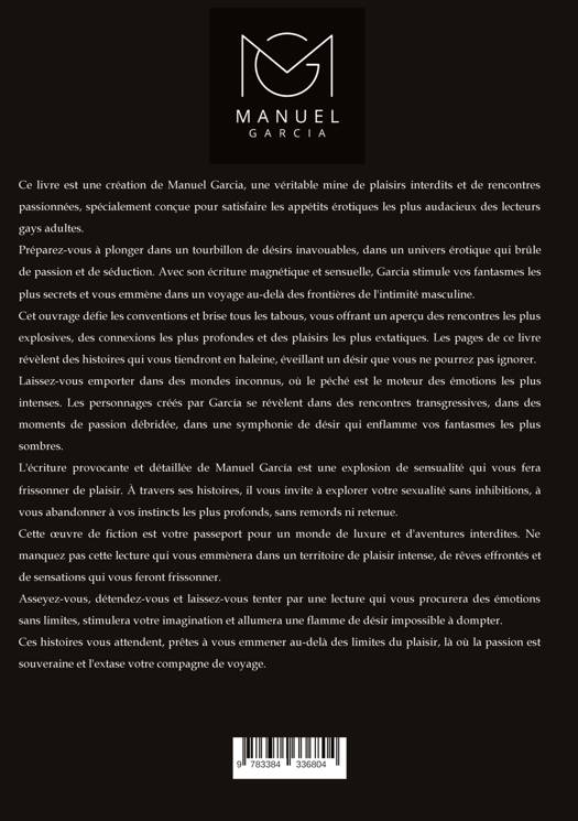 Ce livre est une création de Manuel Garcia, une véritable mine de plaisirs interdits et de rencontres passionnées, spécialement conçue pour satisfaire les appétits érotiques les plus audacieux des lecteurs gays adultes.Prépare-toi à te plonger dans un tourbillon de désirs inavouables, dans un univers érotique qui brûle de passion et de séduction. Avec son écriture magnétique et sensuelle, Garcia stimule tes fantasmes les plus secrets, t'emmenant dans un voyage au-delà des frontières de l'intimité masculine.Cet ouvrage défie les conventions et brise tous les tabous, t'offrant un aperçu des rencontres les plus explosives, des connexions les plus profondes et des plaisirs les plus extatiques. Les pages de ce livre révèlent des histoires qui te tiendront collé aux mots, éveillant un désir que tu ne pourras pas ignorer.Laisse-toi emporter dans des mondes inconnus, où le péché est le moteur des émotions les plus intenses. Les personnages créés par García se révèlent dans des rencontres transgressives, dans des moments de passion débridée, dans une symphonie de désir qui enflamme tes fantasmes les plus sombres.L'écriture provocante et détaillée de Manuel García est une explosion de sensualité qui te fera frissonner de plaisir. À travers ses histoires, il t'invite à explorer ta sexualité sans inhibitions, à t'abandonner à tes instincts les plus profonds, sans remords ni retenue.Cette oeuvre de fiction est ton passeport pour un monde de luxure et d'aventures interdites. Ne manque pas cette lecture qui t'emmènera dans un territoire de plaisir intense, de rêves effrontés et de sensations qui te feront frissonner.Assieds-toi, détends-toi et laisse-toi aller à une lecture qui te procurera des émotions sans limites, stimulera ton imagination et allumera une flamme de désir qui ne peut être apprivoisée.Ces histoires t'attendent, prêtes à t'emmener au-delà des limites du plaisir, là où la passion est souveraine et où l'extase est ton compagnon de voyage.