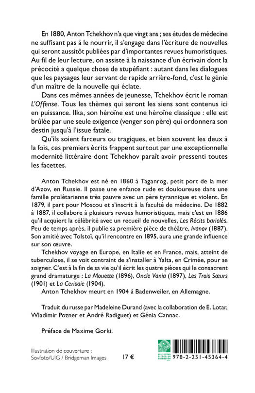 Dans ces mêmes années de jeunesse, Tchekhov écrit le roman L’Offense. Tous les thèmes qui seront les siens sont contenus ici en puissance. Ilka, son héroïne est une héroïne classique : elle est brûlée par une seule exigence (venger son père) qui ordonnera son destin jusqu’à l’issue fatale.