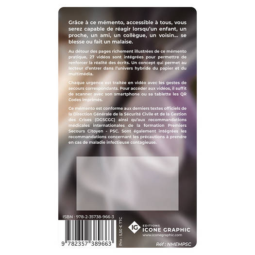 Conforme aux dernières recommandations PSC (décembre 2023) ! L’unité d’enseignement « Premiers Secours Citoyen PSC » a pour objectif de faire acquérir à toute personne les compétences nécessaires à l’exécution d’une action citoyenne d’assistance à personne en réalisant les gestes de premiers secours, conformément aux dispositions en vigueur. Ce mémo synthétique répond aux besoins des formateurs et des associations agréées de sécurité civile de remettre un support de formation en fin de formation permettant à l'apprenant de se remémorer les gestes de premiers secours appris en formation. Il est conforme aux recommandations officielles de la formation "Premiers Secours Citoyen PSC" (PSC) éditées par le Ministère de l'intérieur et la Direction Générale de la Sécurité Civile et de la Gestion des Crises (DGSCGC) de décembre 2023. Avec les centaines de photos, illustrations et schémas, l'apprentissage des premiers secours civiques devient ludique et accessible. Chaque notion, chaque technique, chaque geste de secours, étape par étape est illustré sous différentes formes, dans une approche pédagogique apportant ainsi clarté des textes et accessibilité permettant ainsi au plus grand nombre d'apprendre et se remémorer les gestes de premiers secours. Ce mémento reprend et synthétise les recommandations officielles PSC. Son format pratique, de poche, en fait un support idéal pour tout participant d'une formation PSC. Ce mémento est la version la plus équilibrée de notre gamme, entre synthétisation, format de poche et information complète. D'autres versions sont disponibles sur notre site comme le mémo PSC ou le livre PSC. Vous disposez en accès gratuit de 27 vidéos de formation disponibles par QR Codes qui démontrent la réalisation des gestes d’urgence. Il intègre la mise à jour de la DGSCGC de décembre 2023. SOMMAIRE DÉTAILLÉ : En cas d'urgence (coordonnées personnelles à compléter) ; lexique des abréviations ; Le citoyen de sécurité civile ; la chaîne des secours ; généralités / la protection / réagir devant une attaque terroriste ou une situation de violence / la protection en période épidémique/ l'alerte aux secours / l'alerte pour maladie infectieuse respiratoire ; l’alerte et protection des populations / les mesures barrières et de distanciation / l'obstruction des voies aériennes / les hémorragies / la perte de connaissance / l'arrêt cardiaque / le défibrillateur automatisé externe / les malaises / les plaies graves / les plaies simples / les brûlures graves / les brûlures simples / les traumatismes // 7ème édition - mars 2025 - format 17,5 x 10,5 cm - 88 pages - Réf. NMEMPSC