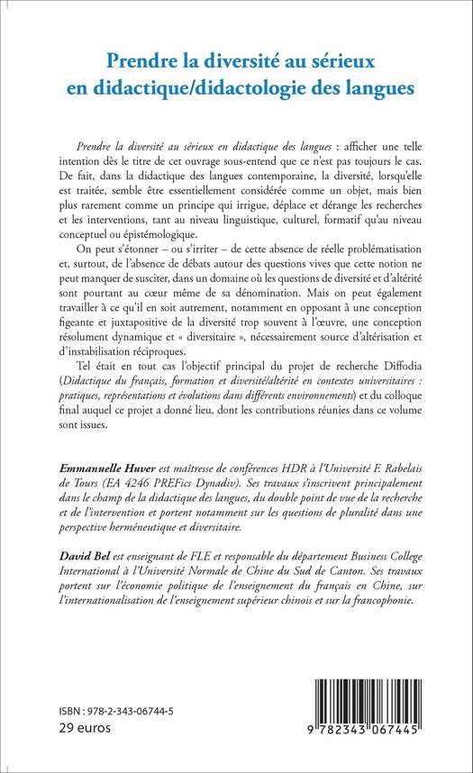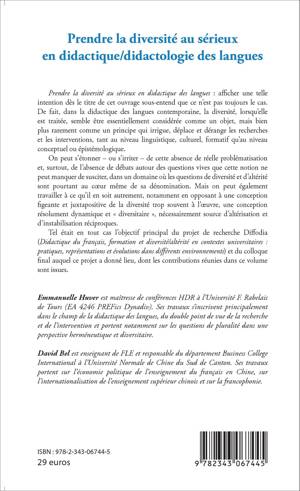 La diversité dans la didactique des langues contemporaines, lorsqu'elle est traitée, semble être essentiellement considérée comme un objet, mais bien plus rarement comme un principe qui irrigue, déplace et dérange les recherches et les interventions, tant au niveau linguistique, culturel, formatif qu'au niveau conceptuel ou épistémologique. Tel est l'objectif principal du projet de recherche Diffodia et du colloque dont les contributions sont réunies dans ce volume.