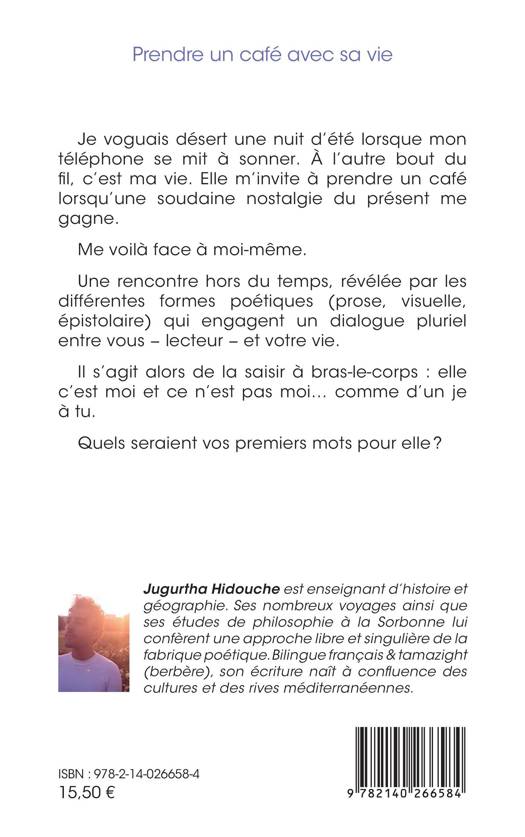 Je voguais désert une nuit d'été lorsque mon téléphone se mit à sonner. À l'autre bout du fil, c'est ma vie. Elle m'invite à prendre un café lorsqu'une soudaine nostalgie du présent me gagne. Me voilà face à moi-même. Une rencontre hors du temps, révélée par les différentes formes poétiques (prose, visuelle, épistolaire) qui engagent un dialogue pluriel entre vous lecteur et votre vie. Il s'agit alors de la saisir à bras-le-corps: elle c'est moi et ce n'est pas moi... comme d'un je à tu. Quels seraient vos premiers mots pour elle ?