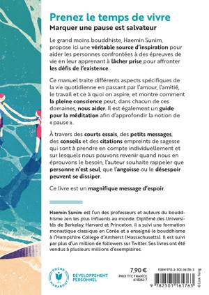 Ce manuel traite différents aspects spécifiques de la vie quotidienne en passant par l’amour, l’amitié, le travail et ce à quoi on aspire, et montre comment la pleine conscience peut, dans chacun de ces domaines, nous aider. Il est également un guide pour la méditation afin d’approfondir la notion de « pause ».