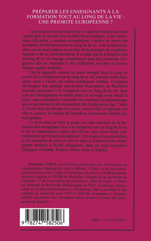 La formation tout au long de la vie apparaît comme un enjeu capital dans le devenir des sociétés démocratiques. Ce livre tente de faire le point sur cette question de la formation des enseignants face à la formation tout au long de la vie et de sa transmission auprès des élèves. Il en analyse les possibilités et les obstacles de mise en oeuvre dans la formation des enseignants destinés à l'école obligatoire, dans six pays européens (Espagne, Finlande, France, Grèce, Italie et Suède).