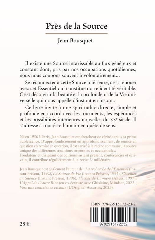 Ce livre invite à une spiritualité directe, simple et profonde en accord avec les tourments, les espérances et les possibilités intérieures nouvelles du XXIe siècle. Il s’adresse à tout être humain en quête de sens. Il existe une Source intarissable au flux généreux et constant dont, pris par nos occupations quotidiennes, nous nous coupons souvent involontairement... Se reconnecter à cette Source intérieure, c’est renouer avec cet Essentiel qui constitue notre identité véritable. C’est découvrir la beauté et la profondeur de la Vie universelle qui nous appelle d’instant en instant.