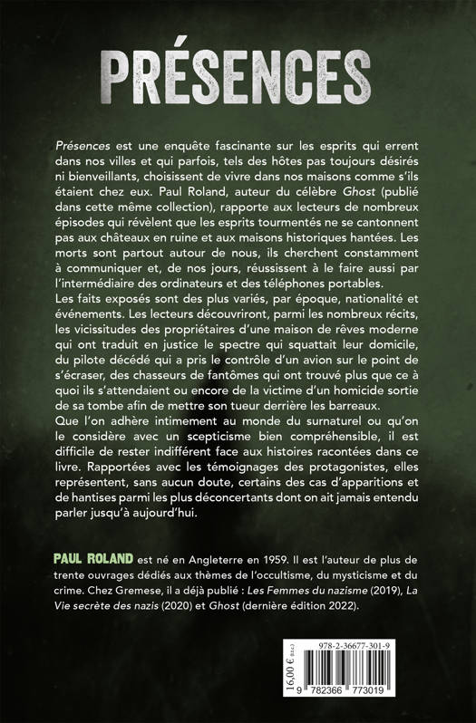 Les fantômes et les esprits habitent notre propre monde, et si nous sommes suffisamment sensibles et psychiquement alertes, nous pouvons arriver à les entendre et à les voir. Présences dévoile de nouvelles preuves troublantes qui révèlent que les esprits tourmentés ne se limitent pas aux châteaux en ruine et aux maisons historiques hantées : ils errent dans nos villes (des banlieues aux centres commerciaux), cherchant constamment à communiquer, et maintenant… ils ont même accès à nos vies grâce aux PC, aux téléviseurs et aux téléphones portables ! La vérité est plus terrifiante que tout ce que l'on peut voir sur un écran de cinéma. Rempli d'histoires vraies et de témoignages effrayants, Présences révèle une vérité dérangeante : personne, nulle part, n'est à l'abri !