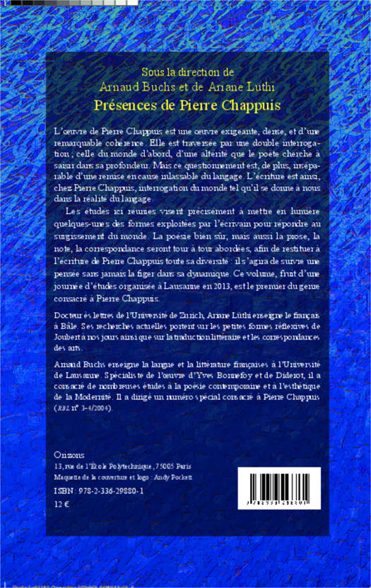 L'écriture est, chez Pierre Chappuis, interrogation du monde tel qu'il se donne à nous dans la réalité du langage. Ses études visent à mettre en lumière quelques-unes des formes exploitées par l'écrivain pour répondre au surgissement du monde. La poésie bien sûr, mais aussi la prose, la note, la correspondance seront tour à tour abordées, afin de restituer à l'écriture de Pierre Chappuis toute sa diversité : il s'agira de suivre une pensée sans jamais la figer dans sa dynamique.