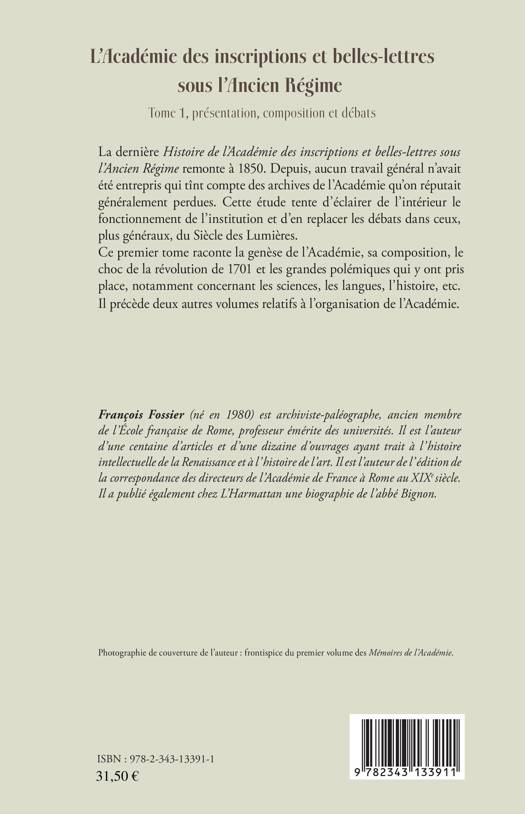 La dernière Histoire de l'Académie des inscriptions et belles-lettres sous l'Ancien Régime remonte à 1850. Depuis, aucun travail basé sur les archives n'a été entrepris. Ce premier volume raconte la genèse de l'Académie, sa composition, le choc de la révolution de 1701 et les grandes polémiques qui y ont pris place, notamment concernant les sciences, les langues, l'histoire, etc.