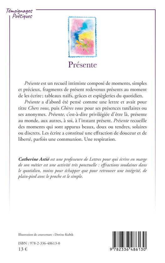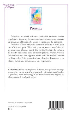 Présente est un recueil intimiste composé de moments, simples et précieux, fragments de présent redevenus présents au moment de les écrire; tableaux naïfs, grâces et espiègleries du quotidien. Présente a d'abord été pensé comme une lettre et avait pour titre Chers vous, puis Chères vous pour ses présences tutélaires ou ses anonymes. Présente, c'est-à-dire privilégiée d'être là, présente au monde, aux autres, à soi, à l'instant présent. Présente recueille des moments qui sont apparus beaux, doux ou tendres, solaires ou discrets. Les écrire a constitué une effraction de douceur et de liberté, parfois une communion. Une respiration.