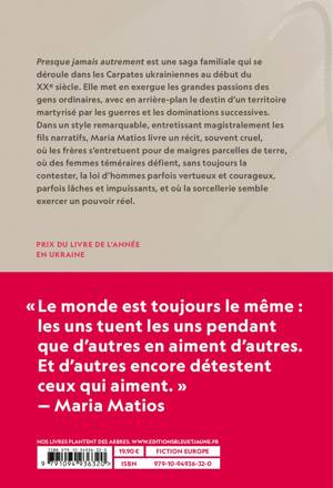 PRESQUE JAMAIS AUTREMENT est une saga familiale qui se déroule dans les Carpates ukrainiennes au début du XXe siècle. Elle met en exergue les grandes passions des gens ordinaires, avec en arrière-plan le destin d’un territoire martyrisé par les guerres et les dominations successives.<br /> Dans un style remarquable, entretissant magistralement les fils narratifs, Maria Matios livre un récit, souvent cruel, où les frères s’entretuent pour de maigres parcelles de terre, où des femmes téméraires défient, sans toujours la contester, la loi d’hommes parfois vertueux et courageux, parfois lâches et impuissants, et où la sorcellerie semble exercer un pouvoir réel.<br /> Prix du livre de l’année en Ukraine