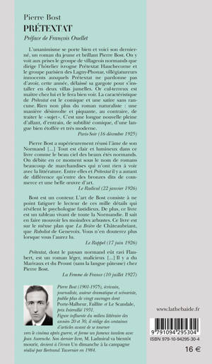 L'unanimisme se porte bien et voici son dernier-né, un roman du jeune et brillant Pierre Bost. On y voit aux prises le groupe de villageois normands que dirige l’hôtelier ivrogne Prétextat Hauchecorne et le groupe parisien des Lagny-Phonar, villégiatureurs innocents auxquels Prétextat ne pardonne pas d’avoir, cette année, délaissé sa gargote pour s’installer en deux villas jumelles. Or cul-terreux est maître chez lui et le fera bien voir. La caractéristique de Prétextat est le comique et une satire sans rancune. Rien non plus du roman naturaliste: une manière désinvolte et piquante, au contraire, de traiter le « sujet ». C’est une longue nouvelle pleine d’allant, d’entrain, de subtilité omique, d’une langue bien étoffée et très moderne. Paris-Soir (16 décembre 1925)