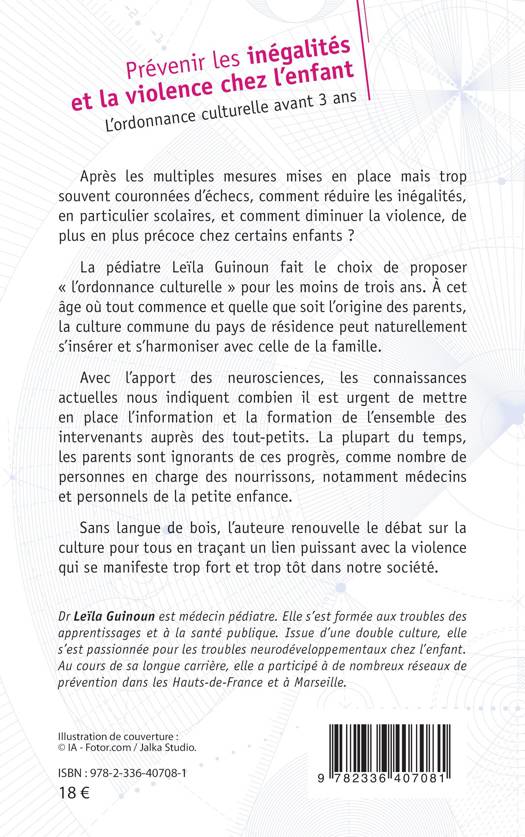Après les multiples mesures mises en place mais trop souvent couronnées d'échecs, comment réduire les inégalités, en particulier scolaires, et comment diminuer la violence, de plus en plus précoce chez certains enfants ? La pédiatre Leïla Guinoun fait le choix de proposer l'ordonnance culturelle pour les moins de trois ans. À cet âge où tout commence et quelle que soit l'origine des parents, la culture commune du pays de résidence peut naturellement s'insérer et s'harmoniser avec celle de la famille. Avec l'apport des neurosciences, les connaissances actuelles nous indiquent combien il est urgent de mettre en place l'information et la formation de l'ensemble des intervenants auprès des tout-petits. La plupart du temps, les parents sont ignorants de ces progrès, comme nombre de personnes en charge des nourrissons, notamment médecins et personnels de la petite enfance. Sans langue de bois, l'auteure renouvelle le débat sur la culture pour tous en traçant un lien puissant avec la violence qui se manifeste trop fort et trop tôt dans notre société.