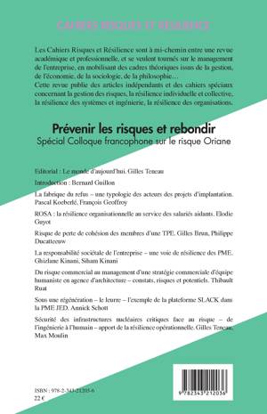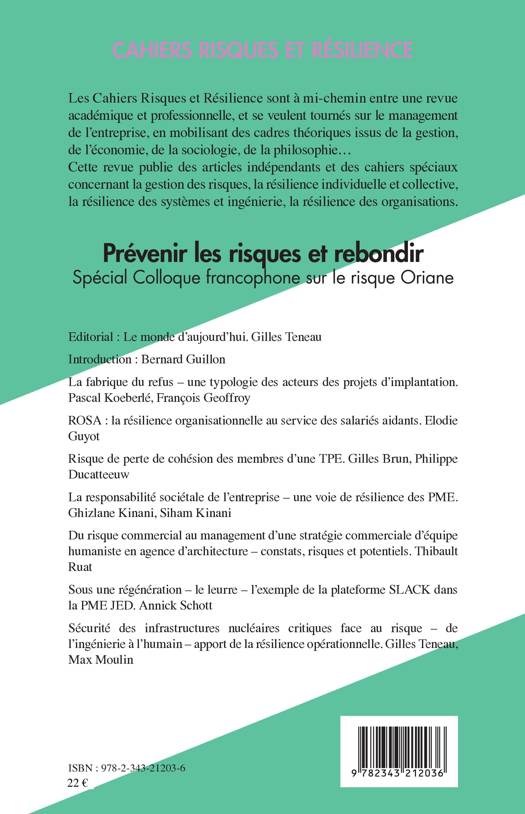 Les Cahiers Risques et Résilience sont à mi-chemin entre une revue académique et professionnelle, et se veulent tournés sur le management de l’entreprise, en mobilisant des cadres théoriques issus de la gestion de l’économie, de la sociologie, de la philosophie. Cette revue publie des articles indépendants et des cahiers spéciaux concernant la gestion des risques, la résilience individuelle et collective, la résilience des systèmes et ingénierie, la résilience des organisations. Ce numéro 2 s’intitule « Prévenir les risques et rebondir ». Spécial Colloque francophone sur le risque Oriane.