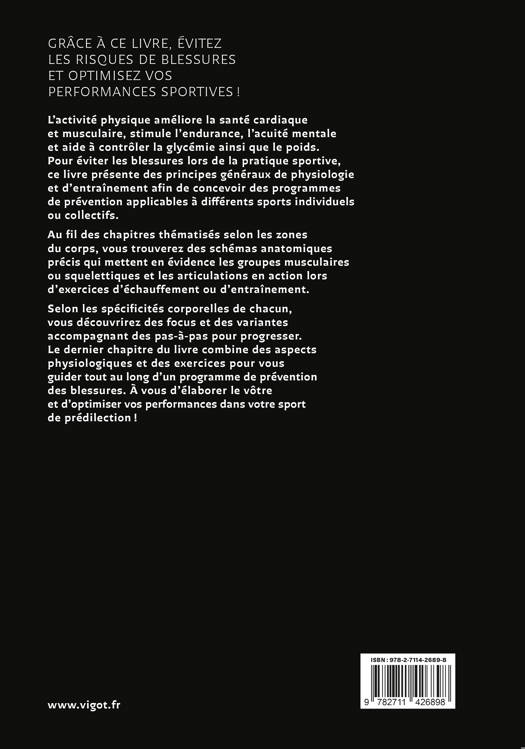 L’activité physique améliore la santé cardiaque et musculaire, stimule l’endurance, l’acuité mentale et aide à contrôler la glycémie ainsi que le poids. Pour éviter les blessures lors de la pratique sportive, ce livre présente des principes généraux de physiologie et d’entraînement afin de concevoir des programmes de prévention applicables à différents sports individuels ou collectifs. Au fil des chapitres thématisés selon les zones du corps, vous trouverez des schémas anatomiques précis qui mettent en évidence les groupes musculaires ou squelettiques et les articulations en action lors d’exercices d’échauffement ou d’entraînement. Selon les spécificités corporelles de chacun, vous découvrirez des focus et des variantes accompagnant des pas-à-pas pour progresser. Le dernier chapitre du livre combine des aspects physiologiques et des exercices pour vous guider tout au long d’un programme de prévention des blessures. À vous d’élaborer le vôtre et d’optimiser vos performances dans votre sport de prédilection !