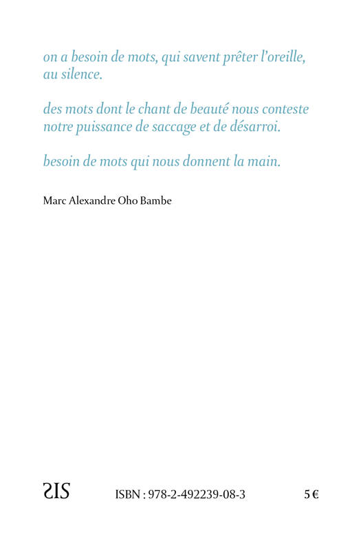Ce texte a surgi en moi un matin bleu de douleur du monde. Saisi par l’urgence d’écrire le manifeste d’un parti poétique et humaniste, la nécessité presque vitale d’énoncer, afin de juxtaposer à la fatalité la résistance à la fatalité, j’ai tressé ce bouquet de mots, peut-être pour réunir nos solitudes et nous rappeler, qu’il y a et qu’il y aura toujours quelque chose. Quelque chose à sauver. Marc Alexandre Oho BambeMarc Alexandre Oho Bambe, écrivain, poète et slameur, maître ès-jeux de l’Académie de Jeux floraux, né à Douala, est l’auteur de plusieurs ouvrages, romans et recueils de poèmes remarqués. Lauréat de plusieurs prix littéraires dont le prix Paul Verlaine de l’Académie française, il porte aussi les mots dans sa voix sur les scènes du monde entier.