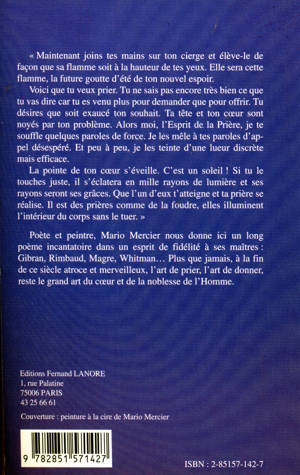 « Maintenant joins tes mains sur ton cierge et élève-le de façon que sa flamme soit à la hauteur de tes yeux. Elle sera cette flamme, la future goutte d’été de ton nouvel espoir. Voici que tu veux prier. Tu ne sais pas encore très bien ce que tu vas dire car tu es venu plus pour demander que pour offrir. Tu désires que soit exaucé ton souhait. Ta tête et ton cœur sont noyés par ton problème. Alors moi, l’Esprit de la Prière, je te souffle quelques paroles de force. Je les mêle à tes paroles d’appel désespéré. Et peu à peu, je les teinte d’une lueur discrète mais efficace. La pointe de ton cœur s’éveille. C’est un soleil ! Si tu le touches juste, il s’éclatera en mille rayons de lumière et ses rayons seront ses grâces. Que l’un d’eux t’atteigne et ta prière se réalise. Il est des prières comme de la foudre, elles illuminent l’intérieur du corps sans le tuer. » Poète et peintre, Mario Mercier nous donne ici un long poème incantatoire dans un esprit de fidélité à ses maîtres : Gibran, Rimbaud, Magre, Whitman… Plus que jamais, à la fin de ce siècle atroce et merveilleux, l’art de prier, l’art de donner, reste le grand art du cœur et de la noblesse de l’Homme.