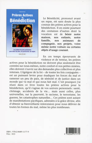 Le Bénédicité, prononcé avant un repas, est sans doute la plus connue des prières actives pour la bénédiction. Il en existe pourtant des centaines d'autres dont la vocation est de bénir notre maison, nos enfants, notre famille, nos animaux de compagnie, nos projets, voire même notre voiture ou certains objets d'usage courant. En ces temps éprouvants de violence et de terreur, les prières actives pour la bénédiction ne doivent plus seulement être centrées sur nous-mêmes, notre confort et nos petites misères, elles doivent s'ouvrir sur des demandes plus collectives et plus intenses. L'égrégore de la foi - de toutes les fois conjuguées - est un puissant levier pour éradiquer les forces du mal et ramener un peu de paix, de sérénité et de justice dans un monde qui va mal et qui nous fait mal. C'est pourquoi j'ai réuni dans ce livre toutes les prières actives pour la bénédiction, qu'il s'agisse de vos univers personnels : santé, chômage, accidents de la vie... mais aussi celles, plus universelles, sur la pauvreté, le racisme, le terrorisme, les guerres, les catastrophes naturelles... Ces prières sont autant de manifestations pacifiques, adressées à la grâce divine, afin d'obtenir sa bienveillante intercession pour nous délivrer de toutes les formes du mal, même les plus insidieuses.