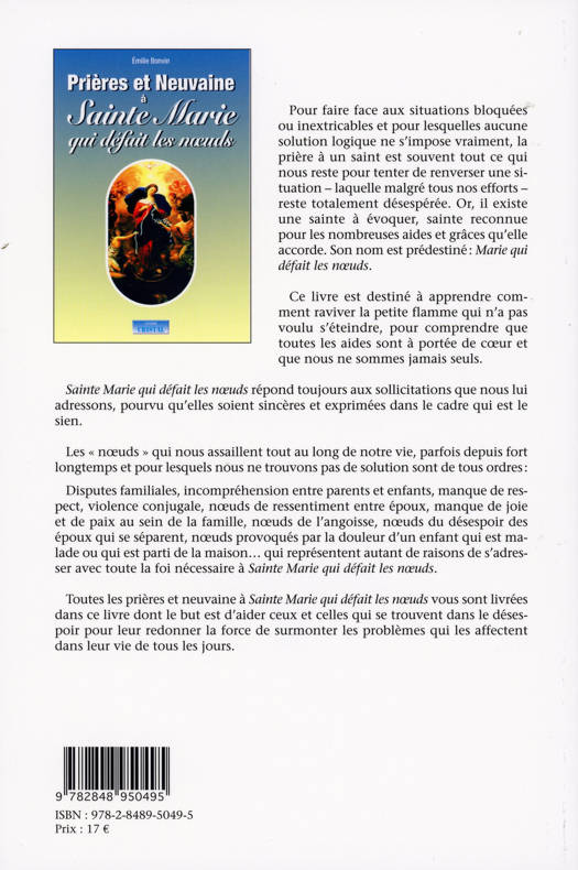 Pour faire face aux situations bloquées ou inextricables et pour lesquelles aucune solution logique ne s'impose vraiment, la prière à un saint est souvent tout ce qui nous reste pour tenter de renverser une situation laquelle malgré tous nos efforts reste totalement désespérée. Or, il existe une sainte à évoquer, sainte reconnue pour les nombreuses aides et grâces qu'elle accorde. Son nom est prédestiné : Marie qui défait les nœuds. Ce livre est destiné à apprendre comment raviver la petite flamme qui n'a pas voulu s'éteindre, pour comprendre que toutes les aides sont à portée de cœur et que nous ne sommes jamais seuls. Sainte Marie qui défait les nœuds répond toujours aux sollicitations que nous lui adressons, pourvu qu'elles soient sincères et exprimées dans le cadre qui est le sien. Les " nœuds " qui nous assaillent tout au long de notre vie, parfois depuis fort longtemps et pour lesquels nous ne trouvons pas de solution sont de tous ordres : disputes familiales, incompréhension entre parents et enfants, manque de respect, violence conjugale, nœuds de ressentiment entre époux, manque de joie et de paix au sein de la famille, nœuds de l'angoisse, nœuds du désespoir des époux qui se séparent, nœuds provoqués par la douleur d'un enfant qui est malade ou qui est parti de la maison... qui représentent autant de raisons de s'adresser avec toute la foi nécessaire à Sainte Marie qui défait les nœuds. Toutes les prières et neuvaine à Sainte Marie qui défait les nœuds vous sont livrées dans ce livre dont le but est d'aider ceux et celles qui se trouvent dans le désespoir pour leur redonner la force de surmonter les problèmes qui les affectent dans leur vie de tous les jours.