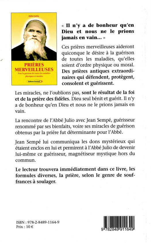 "Il n'y a de bonheur qu'en Dieu et nous ne le prions jamais en vain..." Ces prières merveilleuses aideront quiconque le désire à la guérison de toutes les maladies, qu'elles soient d'ordre physique ou moral. Des prières antiques extraordinaires qui défendent, protègent, consolent et guérissent. Les miracles, ne l'oublions pas, sont le résultat de la foi et de la prière des fidèles. Dieu seul bénit et guérit. Il n'y a de bonheur qu'en Dieu et nous ne le prions jamais en vain. La rencontre de l'Abbé Julio avec Jean Sempé, guérisseur renommé par ses bienfaits, voire ses miracles de guérison obtenus par la prière fut déterminante pour l'Abbé. Jean Sempé lui communiqua les dons mystérieux qui étaient enclos en lui et permirent à l'Abbé Julio de devenir lui-même ce guérisseur, magnétiseur mystique hors du commun. Le lecteur trouvera immédiatement dans ce livre, les formules diverses, la prière, selon le genre de souffrances à soulager.