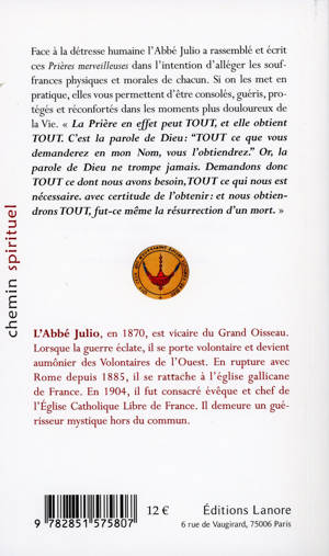 Face à la détresse humaine l'Abbé Julio a rassemblé et écrit ces Prières merveilleuses dans l'intention d'alléger les souffrances physiques et morales de chacun. Si on les met en pratique, elles vous permettent d'être consolés, guéris, protégés et réconfortés dans les moments plus douloureux de la Vie. "La Prière en effet peut TOUT, et elle obtient TOUT." C'est la parole de Dieu: "TOUT ce que vous demanderez en mon Nom, vous l'obtiendrez." Or, la parole de Dieu ne trompe jamais. Demandons donc TOUT ce dont nous avons besoin, TOUT ce qui nous est nécessaire, avec certitude de l'obtenir, et nous obtiendrons TOUT, fut-ce même la résurrection d'un mort.