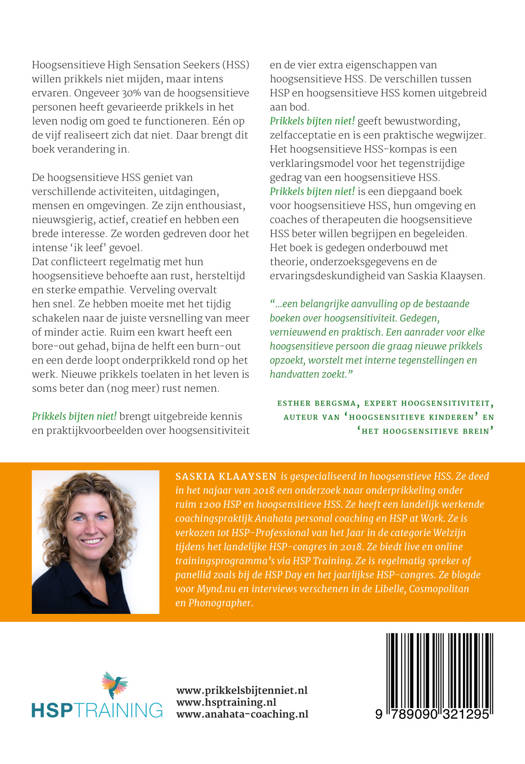 Prikkels bijten niet! brengt uitgebreide kennis en praktijkvoorbeelden over hoogsensitiviteit en de vier extra eigenschappen van hoogsensitieve HSS. De verschillen tussen HSP en hoogsensitieve HSS komen uitgebreid aan bod. Prikkels bijten niet! geeft bewustwording, zelfacceptatie en is een praktische wegwijzer. Het hoogsensitieve HSS-kompas is een verklaringsmodel voor het tegenstrijdige gedrag van een hoogsensitieve HSS. Prikkels bijten niet! is een diepgaand boek voor hoogsensitieve HSS, hun omgeving en coaches of therapeuten die hoogsensitieve HSS beter willen begrijpen en begeleiden. Het boek is gedegen onderbouwd met theorie, onderzoeksgegevens en de ervaringsdeskundigheid van Saskia Klaaysen.
