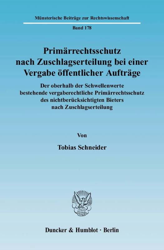 Mit der Erteilung des Zuschlags für einen öffentlichen Auftrag endet der vergaberechtliche Primärrechtsschutz des nichtberücksichtigten Bieters. Durch den Zuschlag kommt ein zivilrechtlicher Vertrag zwischen Auftraggeber und Bieter zustande, dessen Wirksamkeit von vorherigen Verfahrensfehlern bei der Vergabe grundsätzlich nicht berührt wird. Eine Aufhebung im Nachprüfungsverfahren ist ausgeschlossen.