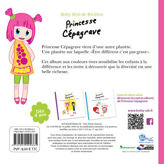 Cet album, écrit par Betty Séré de Rivières et aux illustrations douces et colorées de Philippe Wolff, est destiné aux 3/6 ans avec pour désir de sensibiliser les enfants à la différence. Princesse Cépagrave dénonce le rejet de l’autre, la peur de la différence. Sans être moralisatrice pour autant, cette histoire prône la tolérance, parce que chaque être est unique et doit pouvoir se construire et vivre avec ses atouts, non sur ses manques.