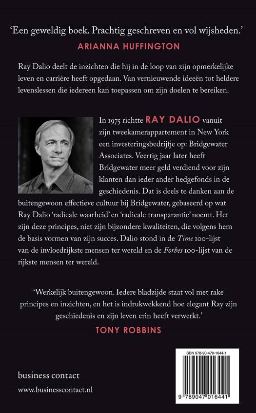 In ‘Principes’ deelt Ray Dalio de vele inzichten die hij in de loop van zijn opmerkelijke carrière heeft opgedaan en laat vervolgens tot in detail zien hoe die worden toegepast in zijn eigen bedrijf. De honderden praktische lessen in dit boek gaan onder meer over het creëren van een goede bedrijfscultuur, effectieve besluitvorming, samenwerking, goed management en het bouwen van sterke teams. Iedereen kan de heldere levenslessen en inzichten die Ray Dalio in ‘Principes’ deelt toepassen om zijn eigen doelen te bereiken. In 1975 richtte Dalio vanuit zijn tweekamerappartement in New York een investeringsbedrijfje op: Bridgewater Associates. Veertig jaar later heeft Bridgewater meer geld verdiend voor zijn klanten dan ieder ander hedgefonds in de geschiedenis. Dat is deels te danken aan de buitengewoon effectieve cultuur bij Bridgewater, gebaseerd op wat Ray Dalio ‘radicale waarheid’ en ‘radicale transparantie’ noemt. Het zijn deze principes, niet zijn bijzondere kwaliteiten, die volgens hem de basis vormen van zijn succes.