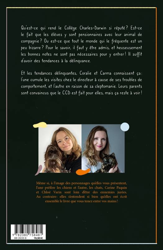 Le Collège Charles Darwin est une école secondaire bien spéciale; il s'agit d'un pensionnat spécialisé en zoothérapie, pour les ados à besoins spéciaux! C'est à cet endroit que Carma Martin, une kleptomane-anxieuse d'envergure, ainsi que Coralie Painchaud, diagnostiquée TDAH-trouble de comportements, commenceront leurs études secondaires ! Chava, le chat de Carma, ainsi que Harry, le chien de Coralie, les suivront partout, assistant aux déboires et débordements de leurs meilleures amies humaines !