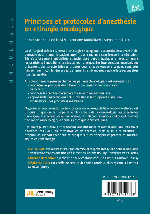 Organisé en sept grandes parties, ce premier ouvrage dédié à l’onco-anesthésie est un outil unique qui fait le point sur les enjeux de la cancérologie, les spécificités par organe, les techniques mini-invasives, la maladie thromboembolique et les voies d’abord en cancérologie, la douleur et les questions éthiques.