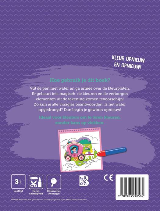 Met dit boek vol prinsessen is er echte magie in het spel! Vul de bijhorende pen met water en kleur ermee op de pagina‘s. Alle kleuren komen tevoorschijn. Nadat alles weer is opgedroogd, verdwijnen de kleuren weer zodat je elke keer opnieuw kunt beginnen. Bij elke tekening staan ook enkele zoekvraagjes die je pas kunt oplossen wanneer je alle details tevoorschijn hebt getoverd. Ideaal voor kleuters om te leren kleuren, zonder kans op vlekken.