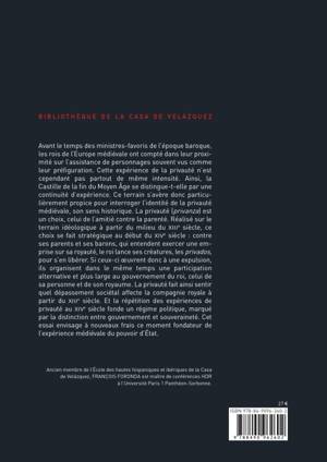 Avant le temps des ministres-favoris de l'époque baroque, les rois de l'Europe médiévale ont compté dans leur proximité sur l'assistance de personnages souvent vus comme leur préfi guration. Cette expérience de la privauté n'est cependant pas partout de même intensité. Ainsi, la Castille de la fin du Moyen Âge se distingue-t-elle par une continuité d'expérience. Ce terrain s'avère donc particulièrement propice pour interroger l'identité de la privauté médiévale, son sens historique. La privauté (privanza) est un choix, celui de l'amitié contre la parenté. Réalisé sur le terrain idéologique à partir du milieu du XIIIe siècle, ce choix se fait stratégique au début du XIVe siècle: contre ses parents et ses barons, qui entendent exercer une emprise sur sa royauté, le roi lance ses créatures, les privados, pour s'en libérer. Si ceux-ci oeuvrent donc à une expulsion, ils organisent dans le même temps une participation alternative et plus large au gouvernement du roi, celui de sa personne et de son royaume. La privauté fait ainsi sentir quel dépassement sociétal affecte la compagnie royale à partir du XIIIe siècle. Et la répétition des expériences de privauté au XIVe siècle fonde un régime politique, marqué par la distinction entre gouvernement et souveraineté. Cet essai envisage à nouveaux frais ce moment fondateur de l'expérience médiévale du pouvoir d'État.