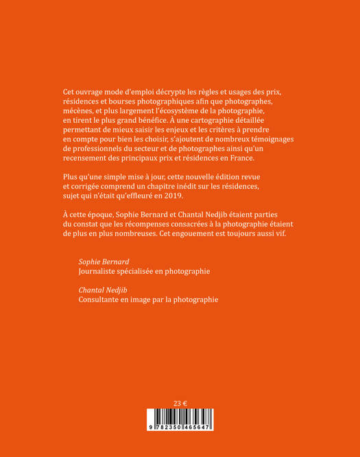 Chantal Nedjib, consultante en image par la photographie, et Sophie Bernard, journaliste spécialisée en photographie, se sont associées pour écrire un guide pratique des prix, résidences, bourses et autres récompenses professionnelles dédiées à la photographie. Ce livre s’adresse principalement aux photographes et mécènes, et plus largement à l’écosystème de la photographie. Un ouvrage mode d’emploi pour décrypter les règles et usages des prix afin d’en tirer le plus grand bénéfice et éviter les pièges. Pourquoi une nouvelle édition ? Après une première édition parue en 2019 réalisée sur la base d’une étude auprès de soixante-dix professionnels, Sophie Bernard et Chantal Nedjib proposent une deuxième édition complétée d’un chapitre sur les Résidences. Des interviews supplémentaires enrichissent l’ouvrage. L’inventaire des prix recensés a été mis à jour et une liste des principales résidences a été ajoutée. Pour étayer leurs points de vue, elles ont interrogé 200 professionnels – responsables d’institutions, commissaires d’exposition, éditeurs, galeries, photographes, observateurs, mécènes, journalistes et collectionneurs – sur l’impact des principaux prix français reconnus dans le secteur de la photographie. 70 d'entre eux ont apporté leurs éclairages et commentaires : - Quels regards ces acteurs portent-ils sur les prix ? - Comment évaluer la qualité et le succès d’un prix ? - Quels bénéfices en tirent les entreprises, mécènes partenaires, photographes, institutions, galeries, festivals, etc.? Toujours conçue comme un guide pratique, cette deuxième version dresse une typologie des résidences. Elle examine les points à maitriser pour bien les choisir, y postuler et bien les concevoir.Â