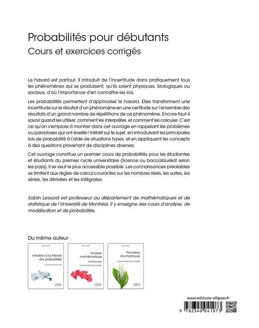 Cet ouvrage constitue un premier cours de probabilités pour les étudiantes et étudiants du premier cycle universitaire (licence ou baccalauréat selon les pays). Il se veut le plus accessible possible. Les connaissances préalables se limitent aux règles de calcul courantes sur les nombres réels, les suites, les séries, les dérivées et les intégrales.