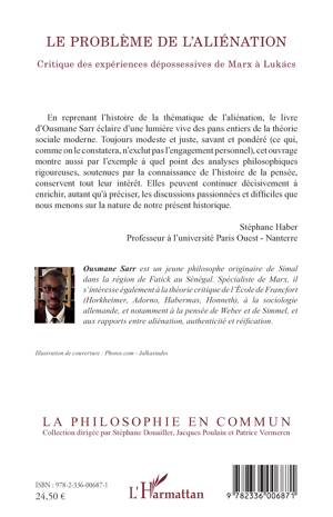 "En reprenant l'histoire de la thématique de l'aliénation, le livre d'Ousmane Sarr éclaire d'une lumière vive des pans entiers de la théorie sociale moderne. Cet ouvrage montre à quel point des analyses philosophiques rigoureuses, soutenues par la connaissance de l'histoire de la pensée, conservent tout leur intérêt. Elles peuvent continuer décisivement à enrichir, autant qu'à préciser, les discussions passionnées et difficiles que nous menons sur la nature de notre présent historique" (Stéphane Haber).