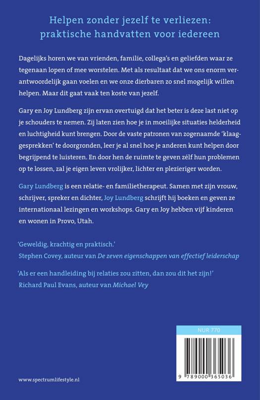 Dagelijks horen we van vrienden, familie, collega's en geliefden waar ze tegenaan lopen of mee worstelen. Met als resultaat dat we ons enorm verantwoordelijk gaan voelen en we onze dierbaren zo snel mogelijk willen helpen. Maar dit gaat vaak ten koste van jezelf. Gary en Joy Lundberg zijn ervan overtuigd dat het beter is deze last niet op je schouders te nemen. Zij laten zien hoe je in moeilijke situaties helderheid en luchtigheid kunt brengen. Door de vaste patronen van zogenaamde 'klaaggesprekken' te doorgronden, leer je al snel hoe je anderen kunt helpen door begrijpend te luisteren. En door hen de ruimte te geven zélf hun problemen op te lossen, zal je eigen leven vrolijker, lichter en plezieriger worden.