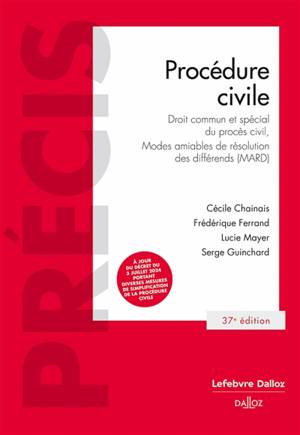 Soucieuse de proposer une vision pédagogique du procès civil, la 37e édition du Précis Dalloz poursuit l'effort entrepris lors de la précédente édition, visant à proposer une présentation modernisée de la procédure civile, et singulièrement de la procédure civile devant le tribunal judiciaire. L'ouvrage prend également compte l'ensemble des éléments de réforme introduits par le décret n° 2023-1391 du 29 décembre 2023 portant simplification de la procédure d'appel en matière civile. Enfin, le chapitre relatif aux modes amiables de règlement des différends est enrichi par les dispositions nouvelles introduites par le décret n° 2023-686 du 29 juillet 2023 portant mesures favorisant le règlement amiable des litiges devant le tribunal judiciaire – ce qui inclut les mécanismes nouveaux de la césure et de l'audience de règlement amiable.