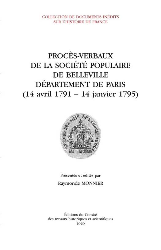 Les procès-verbaux des sociétés populaires sont des sources remarquables de l'histoire politique et sociale. Ce nouveau volume des « Documents inédits sur l'histoire de France » est un témoignage fort de la vie à Belleville sous la Révolution.