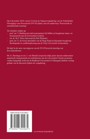Op 6 december 2024 vond in Utrecht de Najaarsvergadering van de Nederlandse Vereniging voor Procesrecht (NVvP) plaats, met als onderwerp ‘Procesrecht en constitutionele toetsing’. Als inleiders traden op: – prof. mr. T. Barkhuysen (advocaat-partner bij Stibbe en hoogleraar staats- en bestuursrecht aan de Universiteit Leiden); – mr. dr. M.J. Vetzo (advocaat bij Pels Rijcken); – prof. mr. G. de Groot (president van de Hoge Raad en bijzonder hoogleraar Rechtspraak en conflictoplossing aan de Vrije Universiteit Amsterdam). Dit deel in de serie van uitgaven van de NVvP bevat de neerslag van deze bijeenkomst. Mr. G. Heeringa en mr. J. van Mourik (respectievelijk junior docent-onderzoeker staatsrecht, bestuursrecht en rechtstheorie aan de Universiteit Utrecht en promovendus burgerlijk recht aan de Radboud Universiteit in Nijmegen) hebben verslag gedaan van de discussie tijdens de vergadering