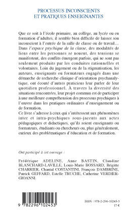 Dans l'espace psychique de la classe, des modalités de liens entre les personnes se nouent, des tensions se manifestent, des conflits émergent parfois qui ne sont pas seulement produits par des conduites rationnelles et volontaires. Une démarche de recherche clinique d'orientation psychanalytique a été engagée à partir du quotidien professionnel pour parvenir à une meilleure compréhension des processus psychiques à l'oeuvre dans les pratiques ordinaires d'enseignement.