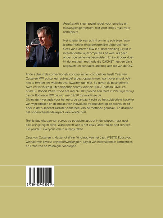 Proefschrift is een praktijkboek voor dorstige en nieuwsgierige mensen; niet voor snobs maar voor liefhebbers. Het is letterlijk een schrift om in te schrijven. Voor je proefnotities én je persoonlijke beoordelingen. Cees van Casteren MW is al decennialang jurylid in internationale wijncompetities en weet als geen ander hoe wijnen te beoordelen. En in dit boek doet hij dat met een methode die CACHET heet en die is uitgewerkt in een tabel, analoog aan die van de OIV. Anders dan in de conventionele concoursen en competities heeft Cees van Casteren MW echter een subjectief aspect opgenomen. Want over smaak valt niet te twisten, en, wellicht over kwaliteit ook niet. Zo gaven de belangrijkste twee critici volledig uiteenlopende scores voor de 2003 Château Pavie en primeur: Robert Parker vond het met 97/100 punten een fantastische wijn terwijl Jancis Robinson MW de wijn met 12/20 diskwalificeerde. Dit incident vestigde voor het eerst de aandacht echt op het subjectieve karakter van wijnkritieken en de impact van individuele voorkeuren op de scores. In dit boek is dat subjectief karakter onderdeel van de methode gemaakt. En daarmee het onderscheidende aspect van Proefschrift. Trek je dus niks aan van scores op populaire apps of in de vakpers maar geef elke wijn je eigen cijfer. Want ook in wijn is het zoals Oscar Wilde ooit schreef: ‘Be yourself; everyone else is already taken.’