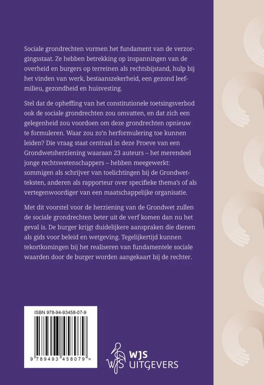 Sociale grondrechten vormen het fundament van de verzorgingsstaat. Ze hebben betrekking op inspanningen van de overheid en burgers op terreinen als rechtsbijstand, hulp bij het vinden van werk, bestaanszekerheid, een gezond leefmilieu, gezondheid en huisvesting. Stel dat de opheffing van het constitutionele toetsingsverbod ook de sociale grondrechten zou omvatten, en dat zich een gelegenheid zou voordoen om deze grondrechten opnieuw te formuleren. Waar zou zo’n herformulering toe kunnen leiden? Die vraag staat centraal in deze Proeve van een Grondwetsherziening waaraan 23 auteurs – het merendeel jonge rechtswetenschappers – hebben meegewerkt: sommigen als schrijver van toelichtingen bij de Grondwetteksten, anderen als rapporteur over specifieke thema’s of als vertegenwoordiger van een maatschappelijke organisatie. Met dit voorstel voor de herziening van de Grondwet zullen de sociale grondrechten beter uit de verf komen dan nu het geval is. De burger krijgt duidelijkere aanspraken die dienen als gids voor beleid en wetgeving. Tegelijkertijd kunnen tekortkomingen bij het realiseren van fundamentele sociale waarden door de burger worden aangekaart bij de rechter.