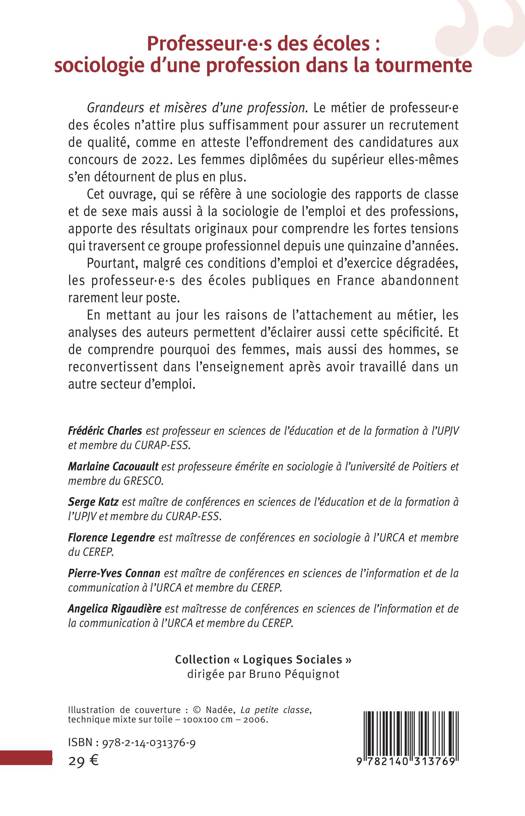 Grandeurs et misères d'une profession. Le métier de professeure des écoles n'attire plus suffisamment pour assurer un recrutement de qualité, comme en atteste l'effondrement des candidatures aux concours de 2022. Les femmes diplômées du supérieur elles-mêmes s'en détournent de plus en plus. Cet ouvrage, qui se réfère à une sociologie des rapports de classe et de sexe mais aussi à la sociologie de l'emploi et des professions, apporte des résultats originaux pour comprendre les fortes tensions qui traversent ce groupe professionnel depuis une quinzaine d'années. Pourtant, malgré ces conditions d'emploi et d'exercice dégradées, les professeures des écoles publiques en France abandonnent rarement leur poste. En mettant au jour les raisons de l'attachement au métier, les analyses des auteurs permettent d'éclairer aussi cette spécificité. Et de comprendre pourquoi des femmes, mais aussi des hommes, se reconvertissent dans l'enseignement après avoir travaillé dans un autre secteur d'emploi.