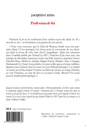Profession de foi est la confession d'un enfant-voyou du siècle XX. Il y raconte sa vie / sa formation, et la genèse de son oeuvre. « Vous vous souvenez que le Gilles de Watteau bande sous son pantalon blanc?? C'est pourquoi j'ai choisi pour la couverture de me dessiner dans la tenue de cette âme (âne??) magnifique. Après ma naissance dans Comilédie publié par Tinbad en 2017, Profession de foi vient avec son cortège de désordres amoureux écrire ma folle jeunesse. Jacqueline Cloarec, Élisabeth Reine, Michèle de Andrade, Brigitte Poussin, Madame Avon, Véronique, Mademoiselle O., Chanel, Sonia, Juliette, et toutes celles que je n'ai pas oubliées, figurent mon écriture dont la cause est tout d'abord physique?: La chambre est ouverte au ciel bleu-turquin?! Comme au blanc de céruse, au rouge d'aréole, au vert Véronèse, au noir de rêve et au jaune Cauda. Moteur?! En route pour le bordel philosophique?! »